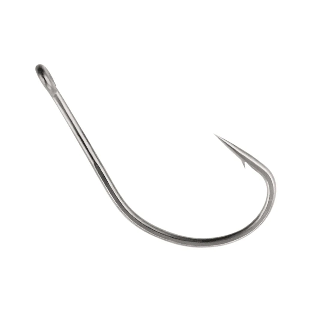 Designed for Neko Style fishing, this hook comes in a standard version and a weedless version with Titanium weedguards. Hook includes a long shank with an offset point for better hooksets. Features Silky Gray finish Super Needle Point, and a 100% closed eye for braid applications.