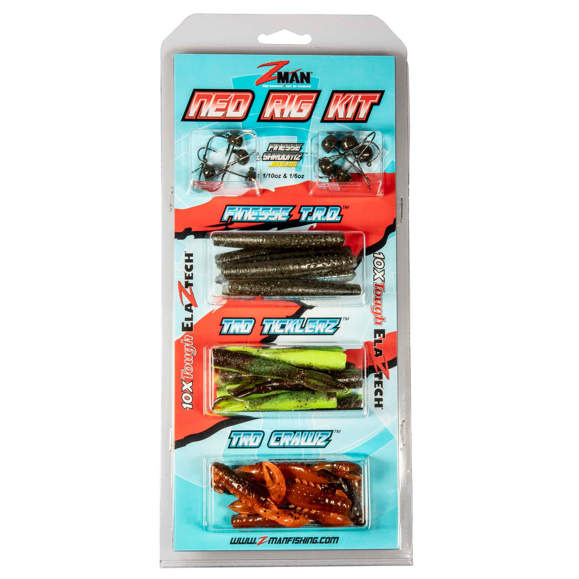 A perfect way to get started fishing the incredibly effective Ned Rig technique, the Ned Rig kit features the most popular and versatile 10X Tough ElaZtech® finesse baits and ShroomZ™ jigheads. Each kit includes Finesse TRD™, TRD TicklerZ™, and TRD CrawZ™ softbaits along with Finesse ShroomZ™ jigheads in 1/6 and 1/10 oz weights. Ideal for bass and a variety of other fresh- and saltwater fishing. Just grab a kit and go fishing!